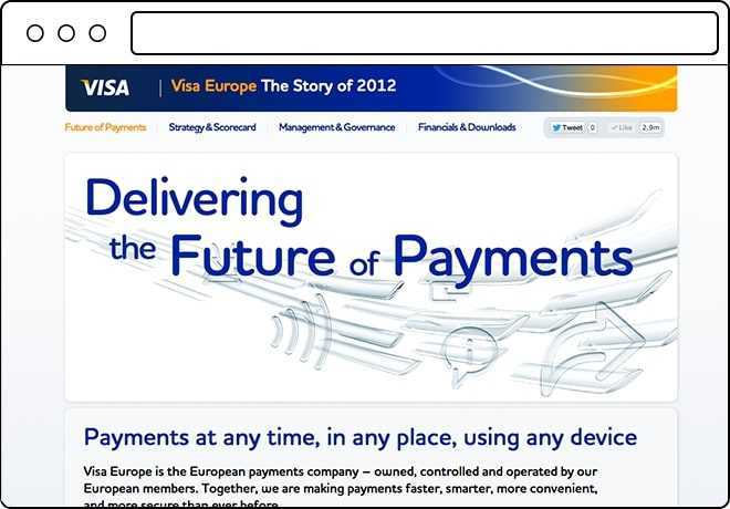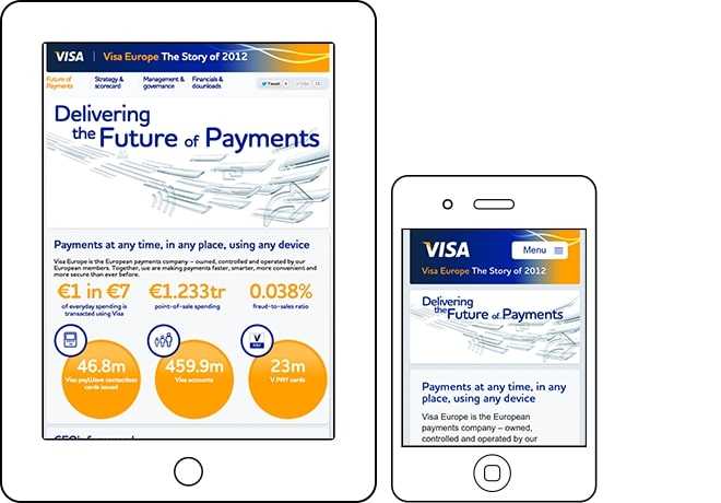 Visa Europe is a payments business.I got to do their Annual Report whilst working at Radley Yeldar. Lead developer on the site with a responsive design to enable it to ensure mobile and tablet compatibility as well.